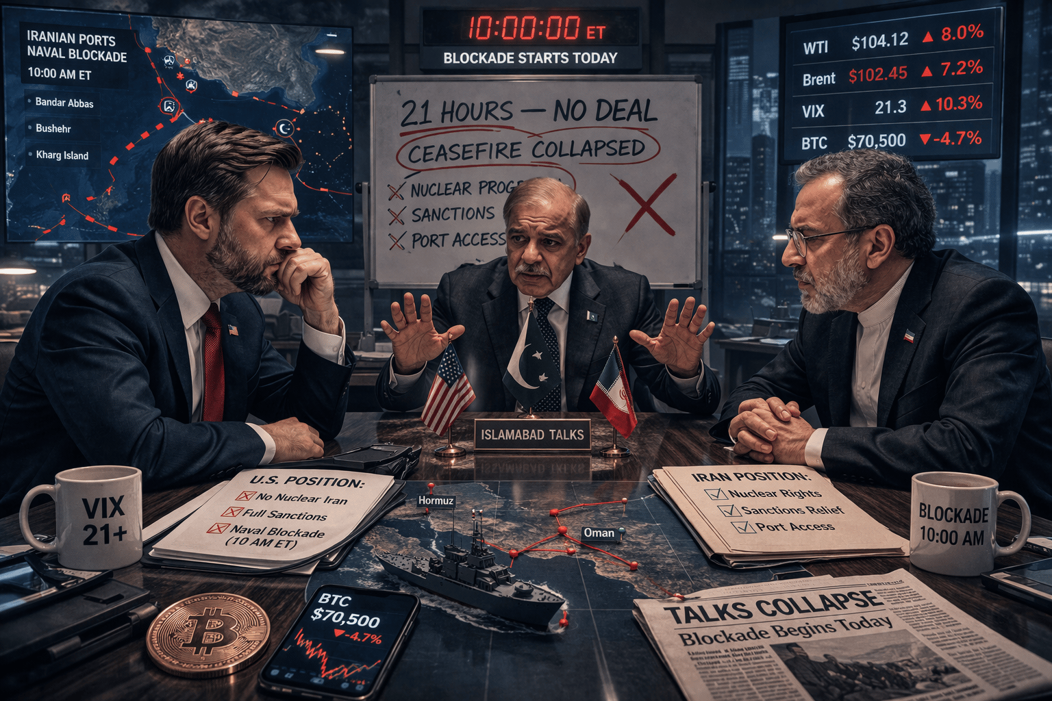 Twenty-one hours of talks in Islamabad produced nothing. Trump ordered a naval blockade of Iranian ports effective 10 a.m. ET. Oil is back above $100. Bitcoin fell from a $74K weekend high to $70,500. The ceasefire relief trade lasted five days.